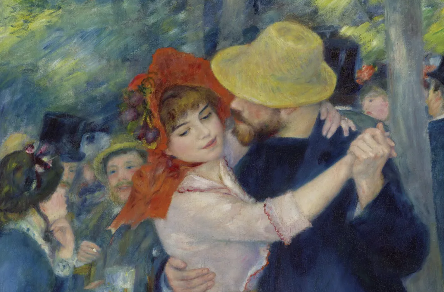 He would draw the eye by painting some elements in focus, and some blurred. In this dance, the only two objects picked out in full clarity are the skin of the two dancers, and the red stitching of the dress. This blurring is paradoxical: the trees and seated figures appear motion-blurred, as the spinning woman is rendered with the clarity of a statue. This is why Renoir’s genius extends to storytelling. He puts the viewer in the position of the male lover: unaware of the meaningless blur of drinkers and woodland, totally focused on the girl. The man, forgetting himself, is pictured in dark anonymity. The woman, framed by her bonnet and draped in silk, dominates both our experience, and his.