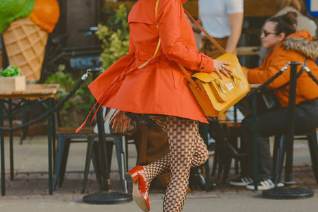 Functionality, of course, should not be forgotten. As much as cycling in a sweeping trench offers ultimate main-character energy, the drama of getting entangled in a bike chain is rarely worth it. On cycle-heavy days, I prefer to lean into eccentric accessories. Cherry red tights, and a satchel the colour of sunshine and egg yolks, are my latest ‘dopamine’ obsessions.