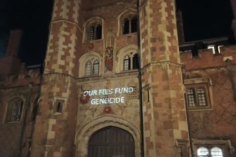 At around 7:30pm on Friday (23/01), a small group of activists projected a series of statements onto the Great Gate of St John’s College, including “no arms, no oil, no empire,” “Cambridge University funds arms,” and “our fees fund genocide”.