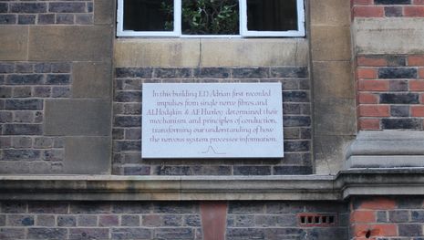 We will begin our tour somewhere that will be familiar to most Bio NatSci students: Downing Site! Those who were attentive when going to their IA Physiology of Organisms lectures may have spotted two plaques on the outside of the Physiology, Development and Neuroscience (PDN) Department building. This is where Edgar Douglas Adrian, who was a Natural Sciences student at Trinity College, first recorded electrical signals emitted by single nerve fibres. Two other Trinity Natural Scientists (Sir Andrew Huxley and Sir Alan Hodgkin) followed in his footsteps and later won the 1963 Nobel Prize in Physiology or Medicine for discovering action potentials in nerves. Hodgkin and Huxley performed experiments on giant nerve cells from squid, as their large size (around 0.5mm in diameter) allowed them to use electrodes to measure ion currents through the nerve’s membrane.