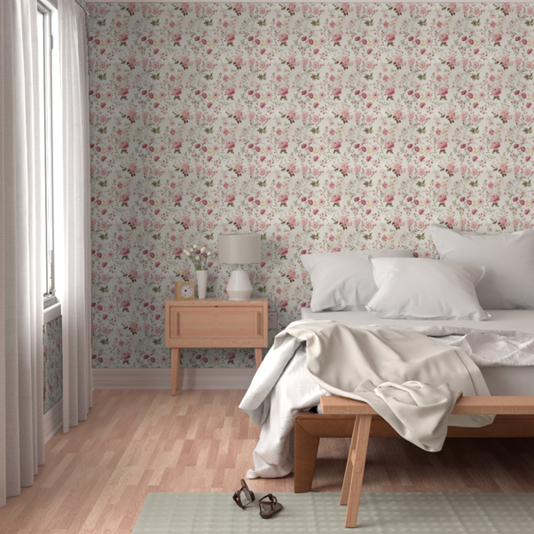Cottage florals are denser, warmer, and more layered. They feel cosy, especially in older homes with wood trim, panelling, or picture rails. They also work well on short walls that need “presence”.