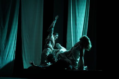 The physical chemistry between Griso’s Macbeth and Brian’s Lady Macbeth is one of the highlights of the performance. Everything returns to the corporeal and so, fittingly, does the relationship between them: Macbeth first appears to his wife from between the draped sheets and for a moment both are arrested, Brian’s expression invisible to the audience as Griso beams from his place behind her before the two at last come together. Lady Macbeth’s liquid sensuality is a force which Macbeth is visibly desperate to chase, his striding movements suddenly almost wooden when compared to the way his wife chooses perfect moments to slink across the stage.